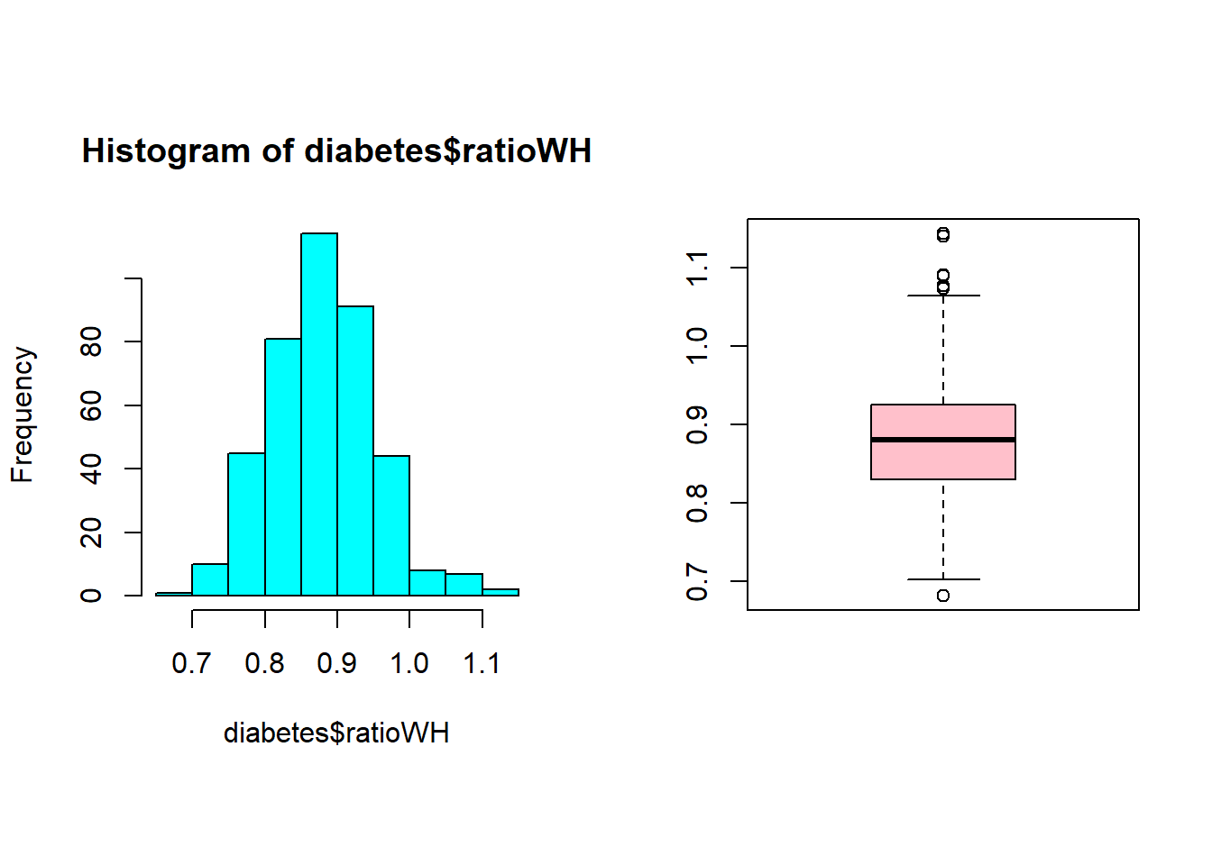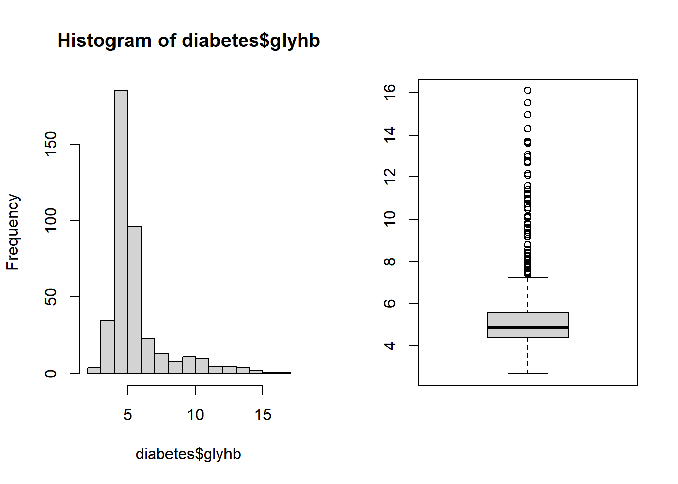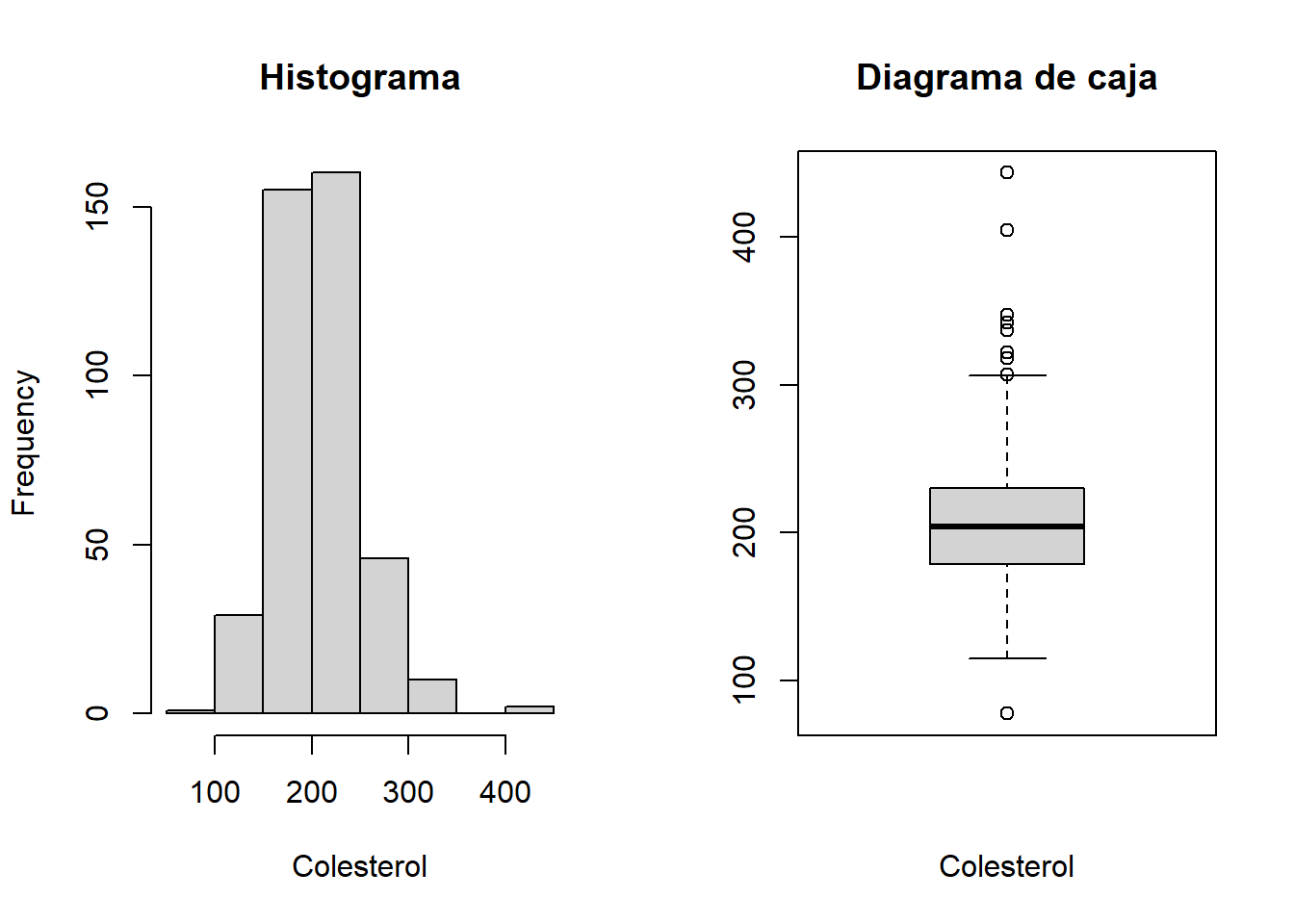 par(mfrow=c(1,2))hist(diabetes$chol, main="Histograma", xlab="Colesterol")boxplot(diabetes$chol, main="Diagrama de caja", xlab="Colesterol")