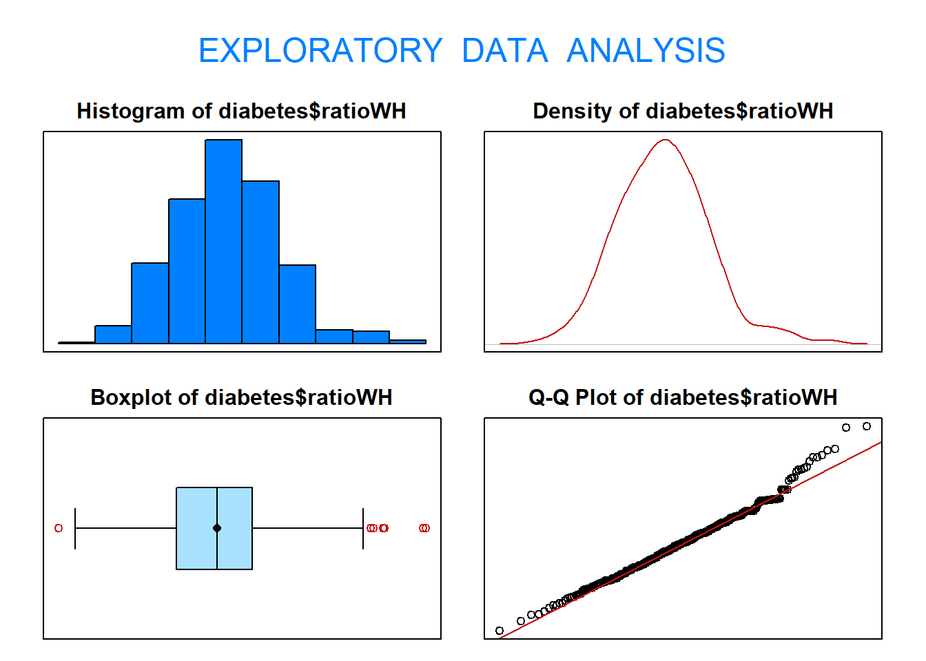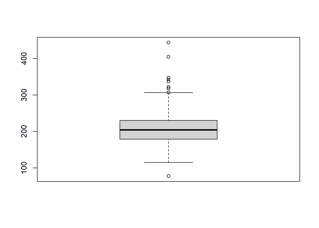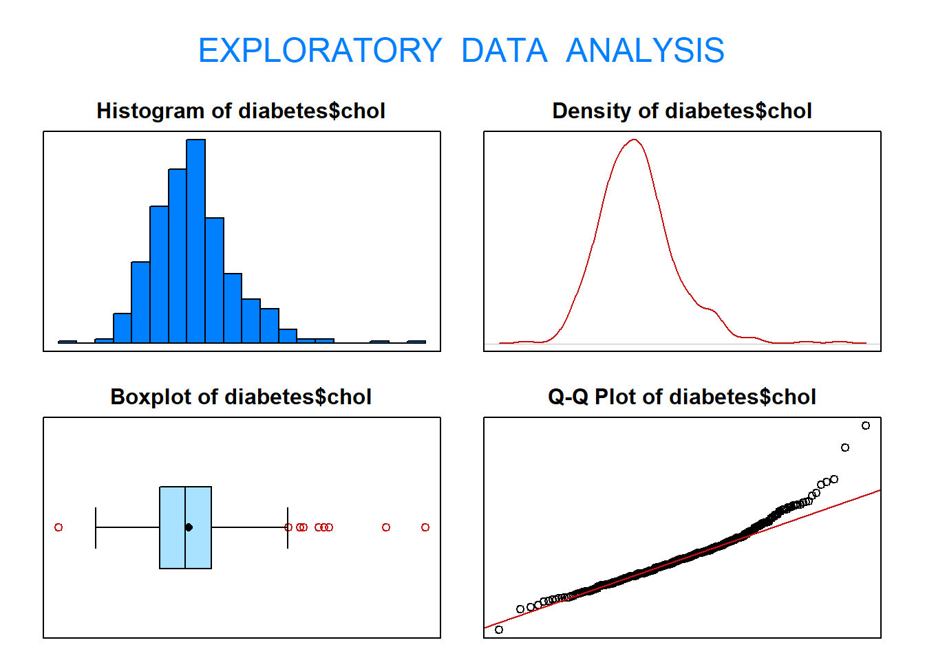 par(mfrow=c(1,2))hist(diabetes$chol, main="Histograma", xlab="Colesterol")boxplot(diabetes$chol, main="Diagrama de caja", xlab="Colesterol")
