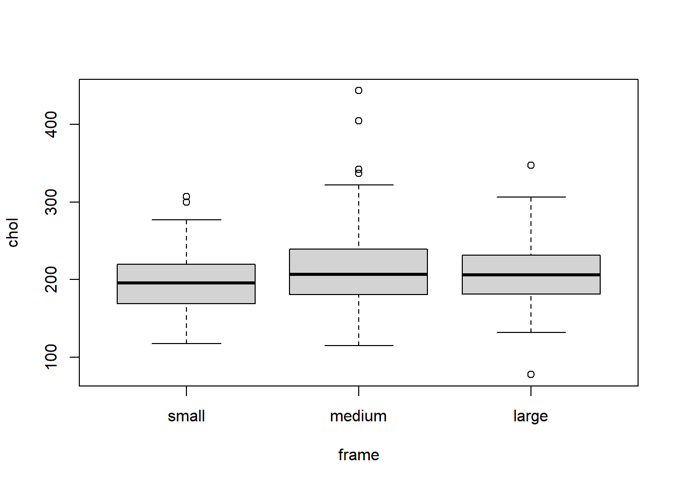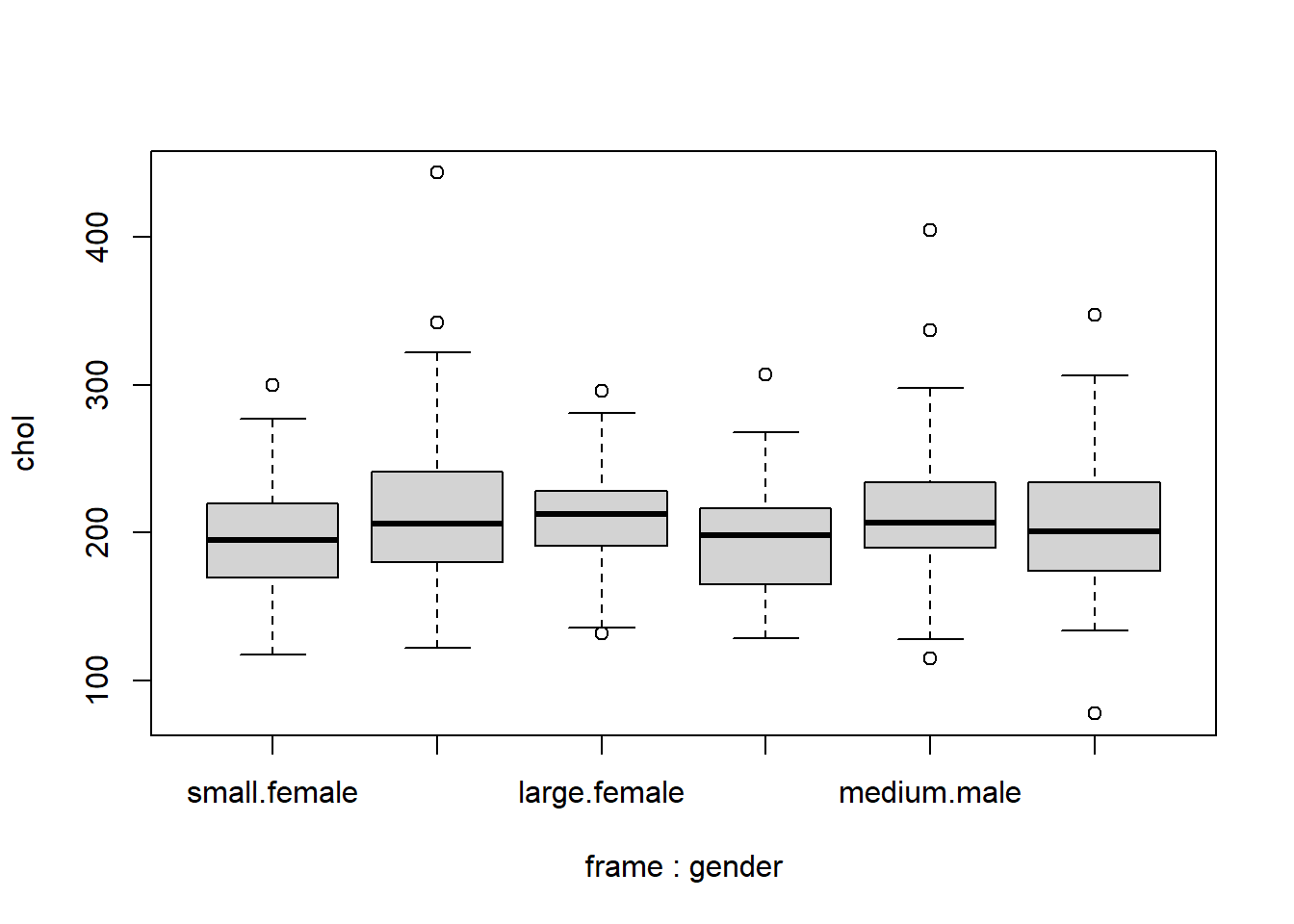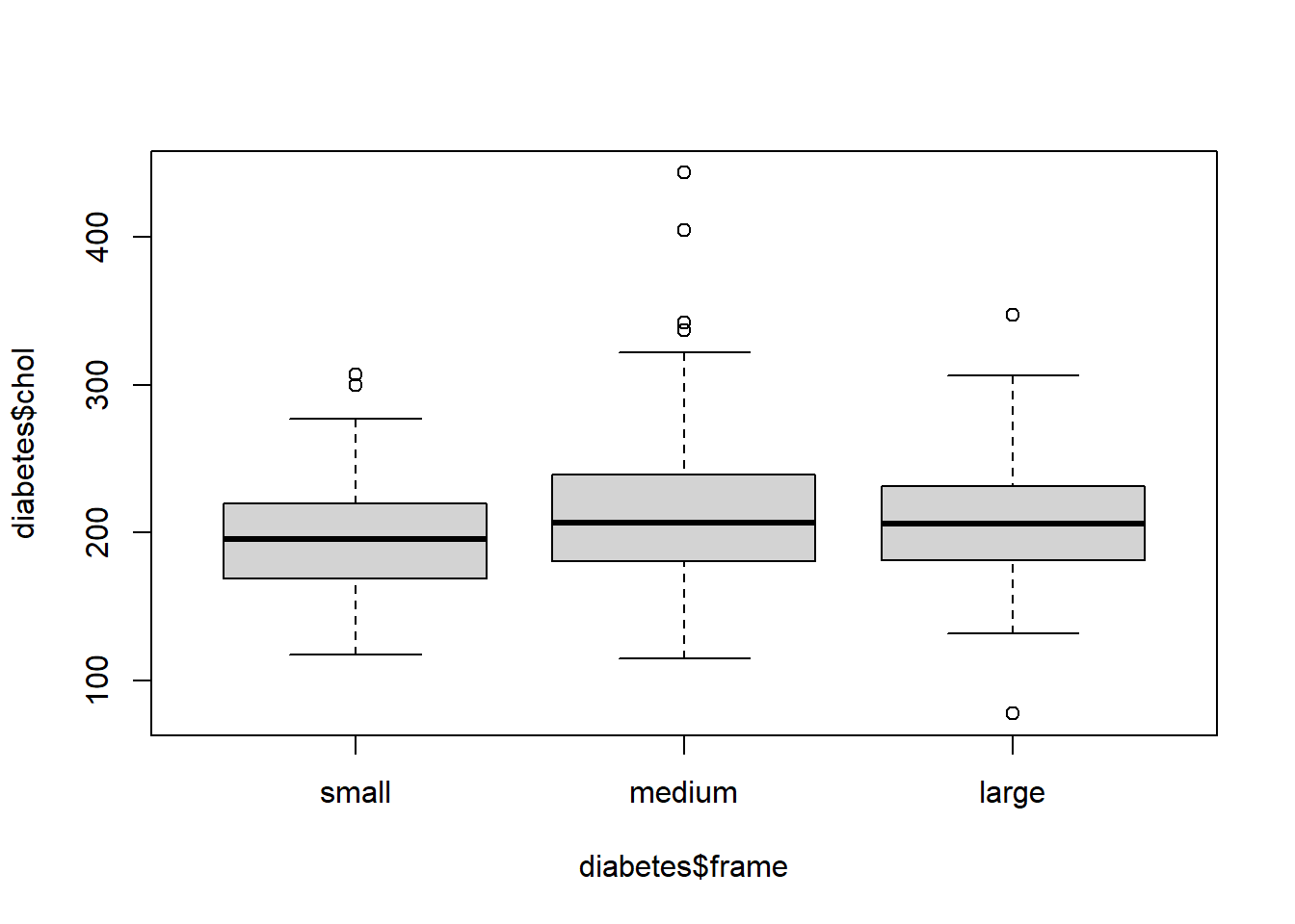 # También se puede escribir como:boxplot(chol ~ frame, data=diabetes)