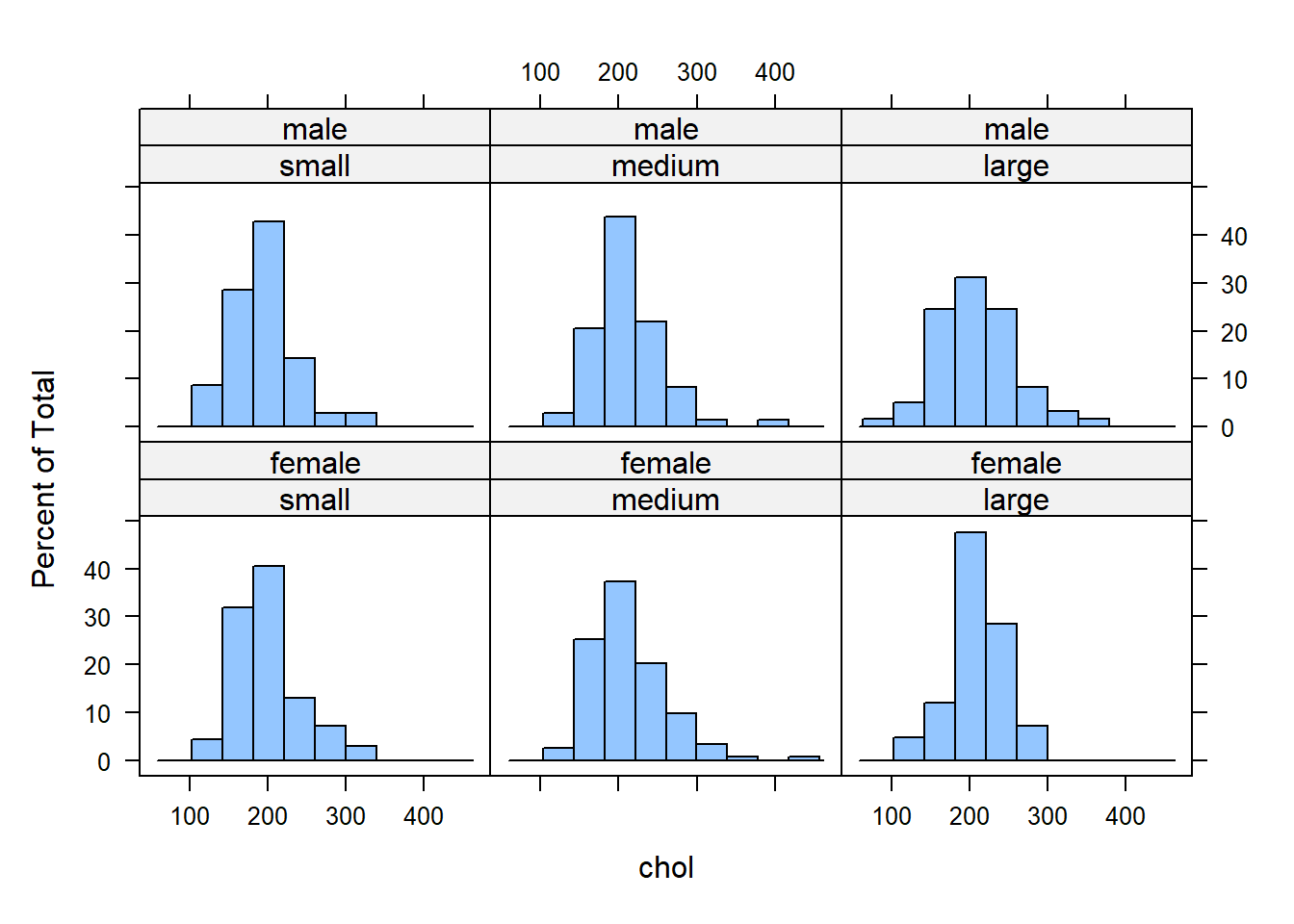 1.21 Realiza un histograma de la variable chol según las categorías de la variable frame y la variable gender.