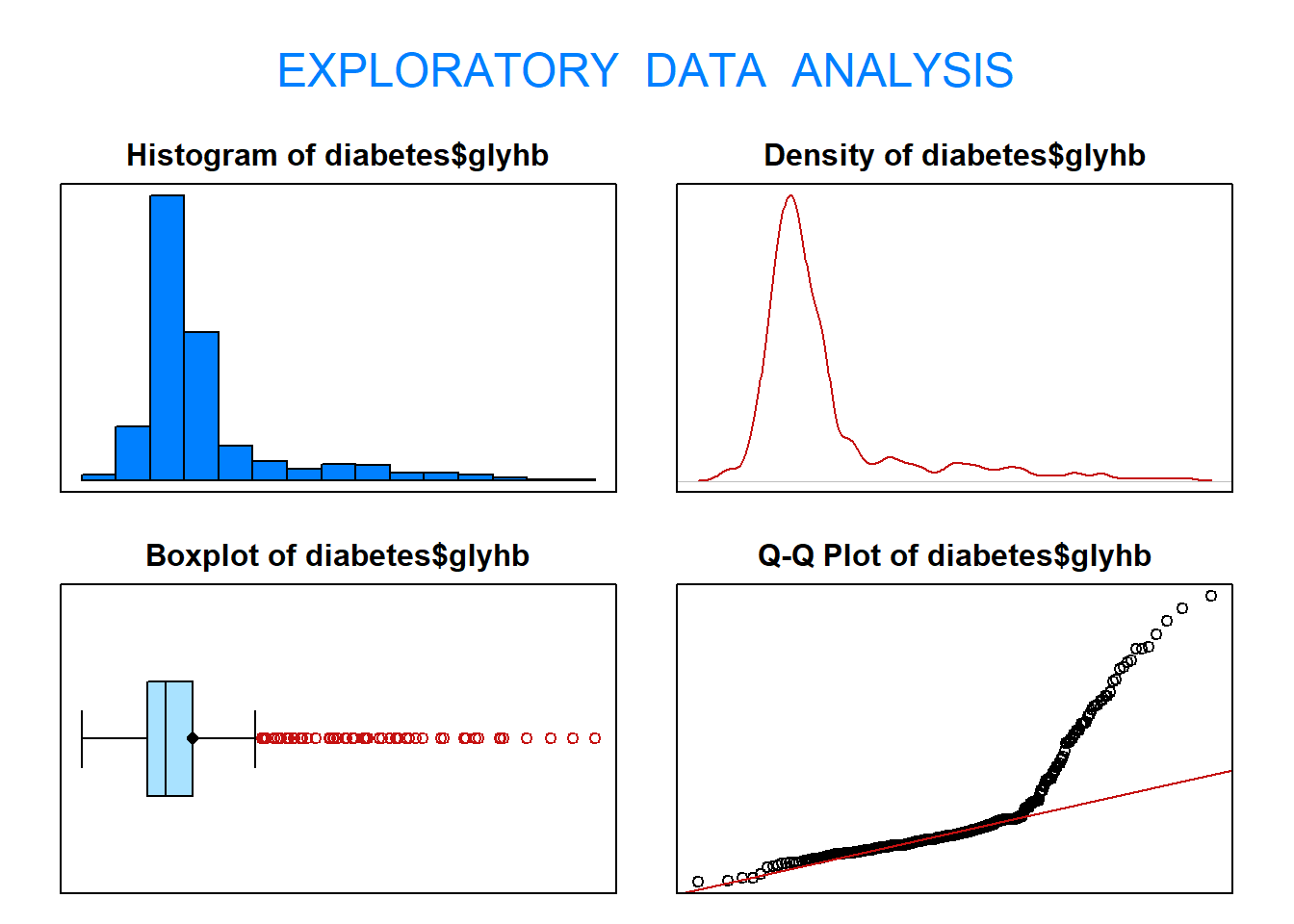 1.22 Calcula la media, la mediana, los cuartiles y la desviación típica de la variable glyhb. Explica cómo está de dispersa utilizando el histograma, el diagrama de cajas, los cuartiles y la desviación típica.