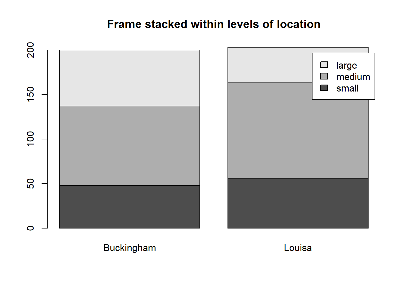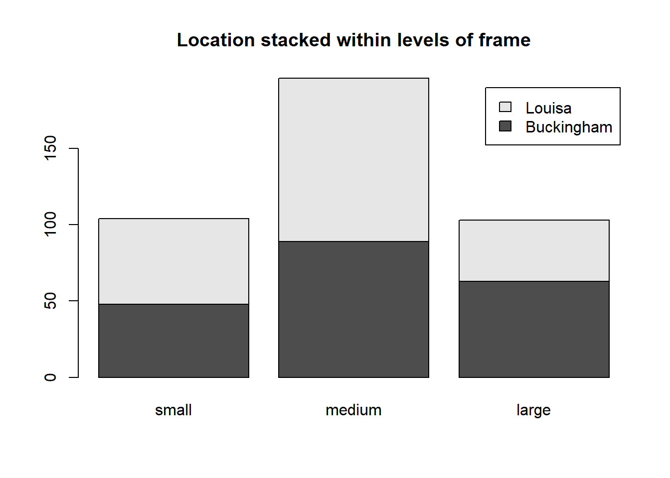 barplot(X, main="Location stacked within levels of frame", legend.text=TRUE)