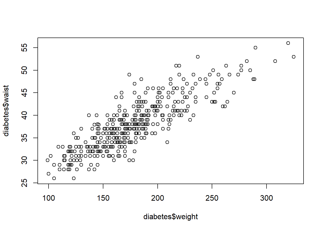 3.1 Realiza un diagrama de dispersión de las variables weight y waist. ¿Crees que existe relación lineal entre ambas variables? Calcula la covarianza y el coeficiente de correlación lineal.