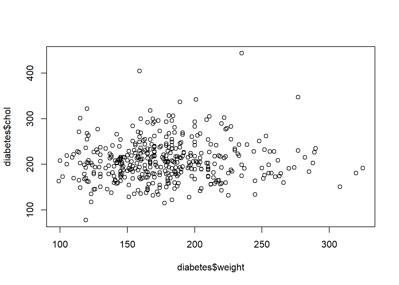 3.2 Realiza un diagrama de dispersión de las variables chol y weight. ¿Crees que existe relación lineal entre ambas variables? Calcula la covarianza y el coeficiente de correlación lineal.