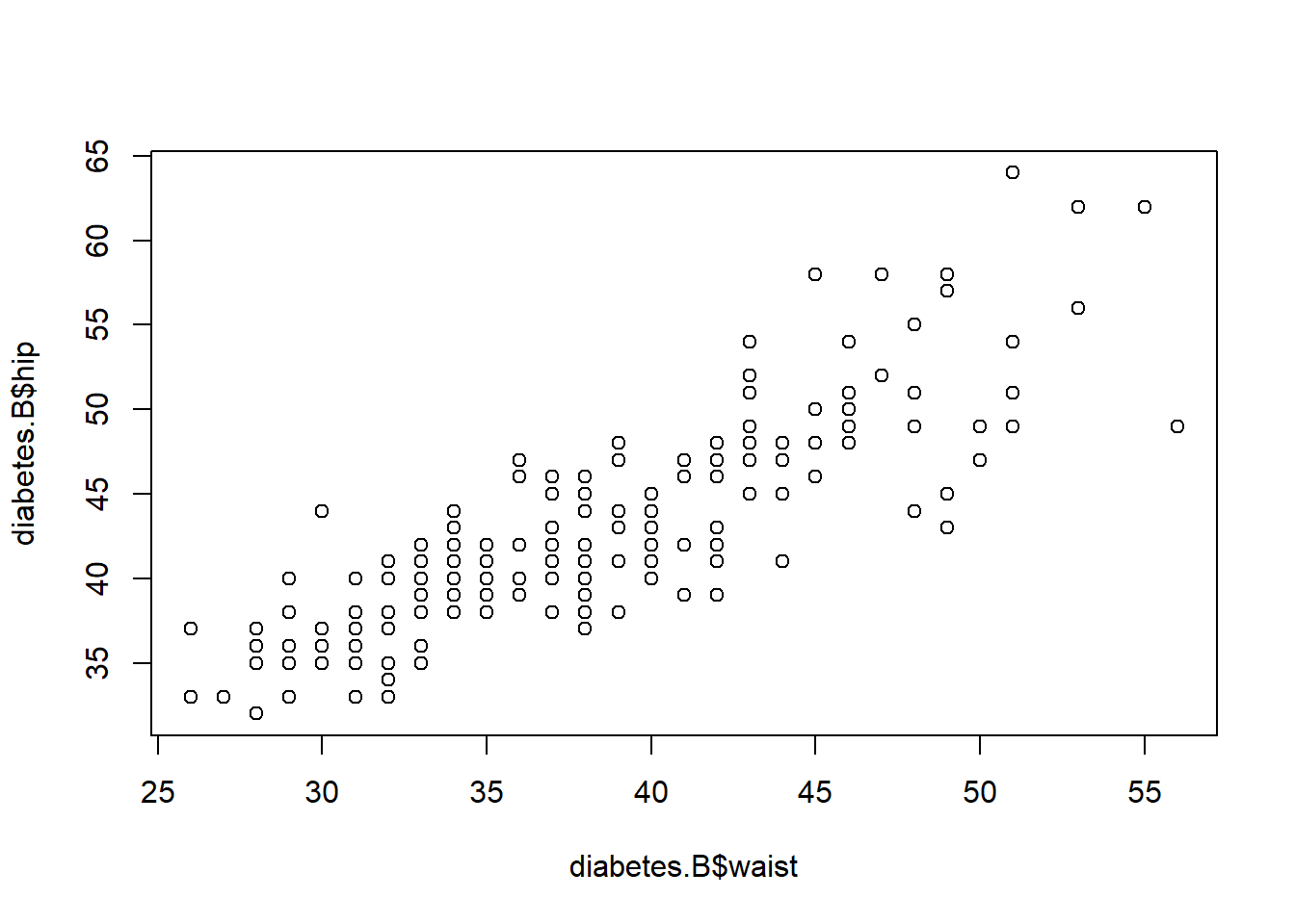 3.3 Selecciona las personas del condado de Buckingham y realiza un diagrama de dispersión de las variables waist y hip. ¿Crees que existe relación lineal entre ambas variables? Calcula la covarianza y el coeficiente de correlación lineal.
