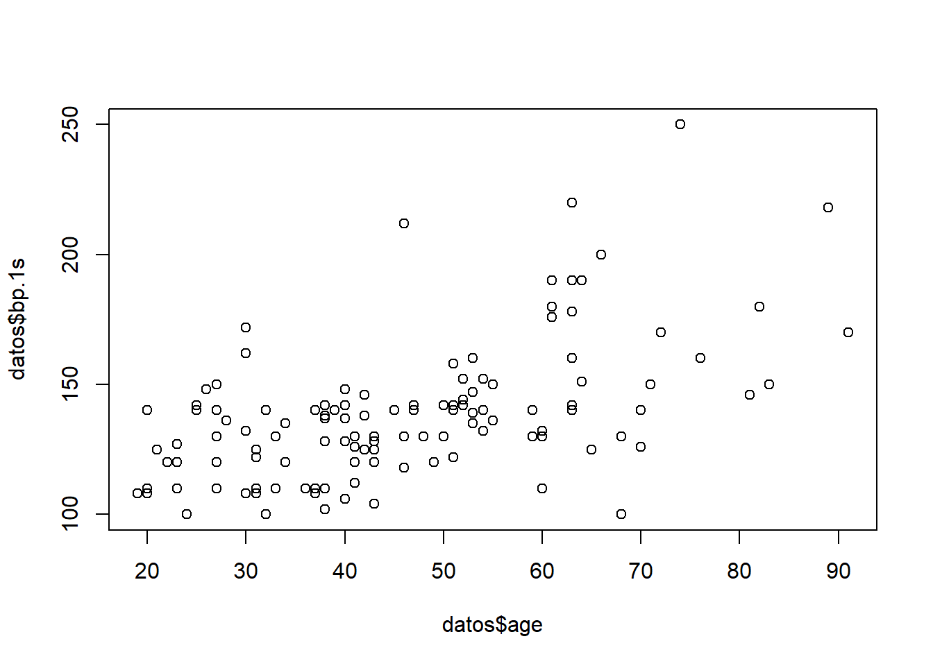 3.4 Selecciona las mujeres con body frame medium y realiza un diagrama de dispersión de las variables bp.1s y age. ¿Crees que existe relación lineal entre ambas variables? Calcula la covarianza y el coeficiente de correlación lineal.