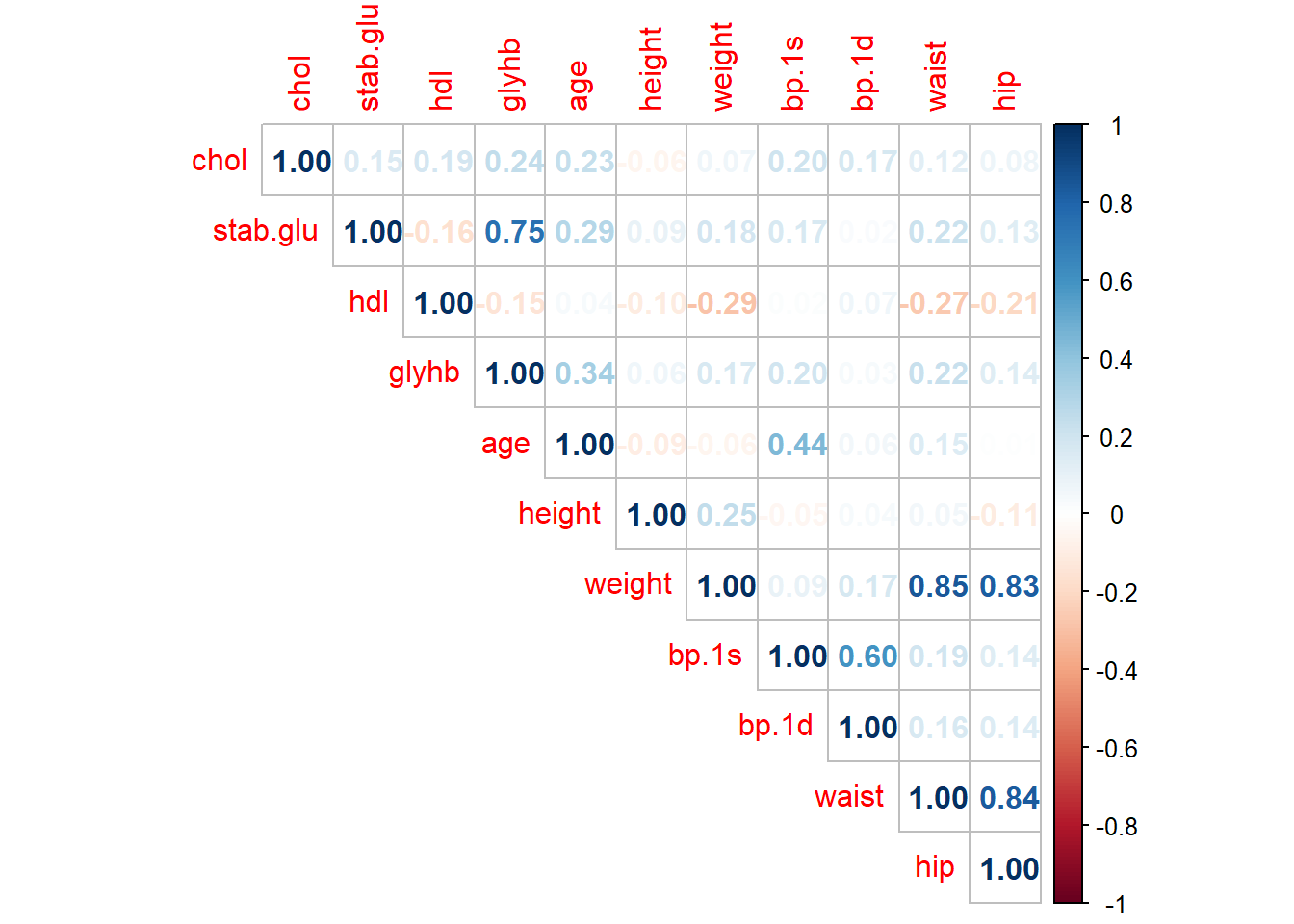 El fichero de datos contiene 19 variables medidas sobre 403 pacientes. Estos pacientes forman parte de un estudio con 1046 sujetos diseñado para investigar la prevalencia de la de obesidad, diabetes, y otros factores de riesgo cardiovasculares para Afroamericanos en Virginia, EEUU.