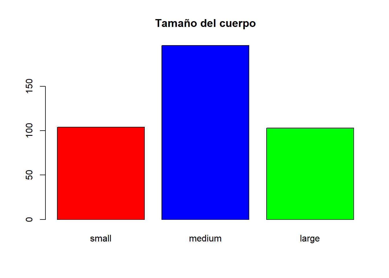n <-table(diabetes$frame)# Diagrama de barrasbarplot(n, col=c("red","blue","green"), main="Tamaño del cuerpo")