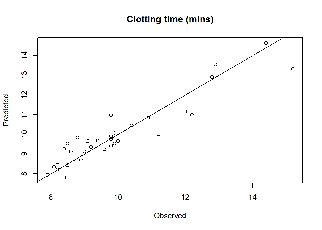 plot(plasma.fitted$Clotting, plasma.fitted$Clotting.fit,xlab="Observed", ylab="Predicted", main="Clotting time (mins)")lines(c(0,20), c(0,20))