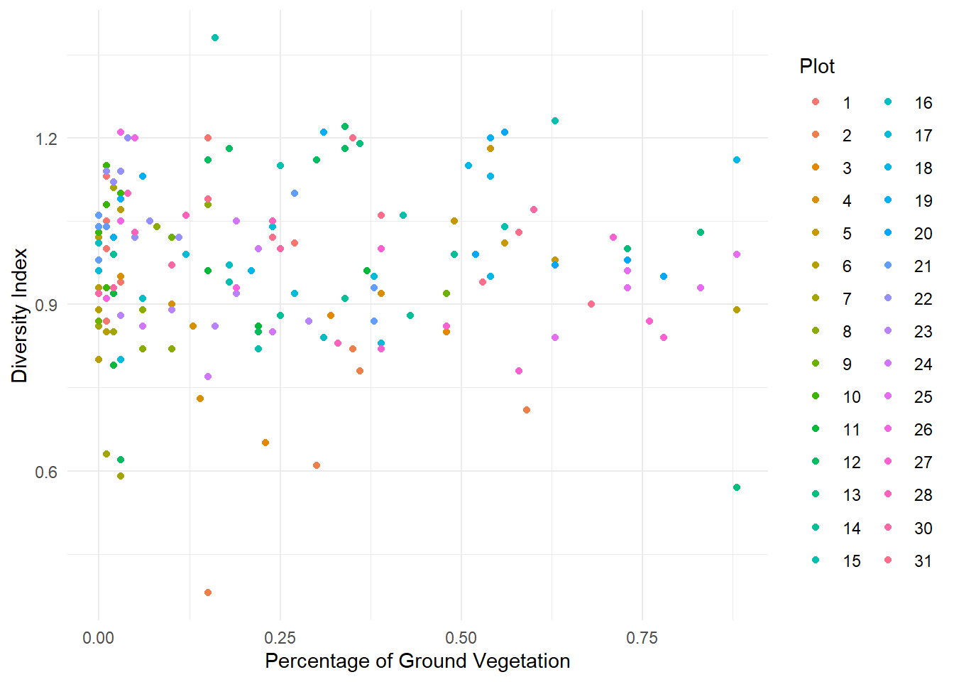 1. Load the data intored in the Spiders.txt file and convert Plot variable to factor. Make descriptive graphs to visualize relationships between the variable of interest and the explanatory variables, taking into account the Plot factor.