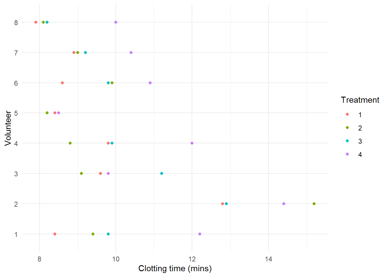 library(ggplot2)ggplot(Plasma, aes(x=Clotting, y=Volunteer, color=Treatment)) +geom_point() +labs(x="Clotting time (mins)", y="Volunteer") +theme_minimal()