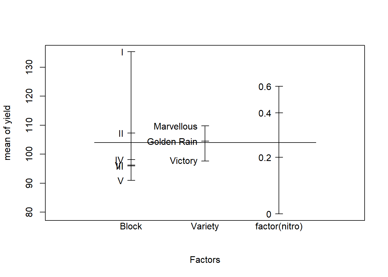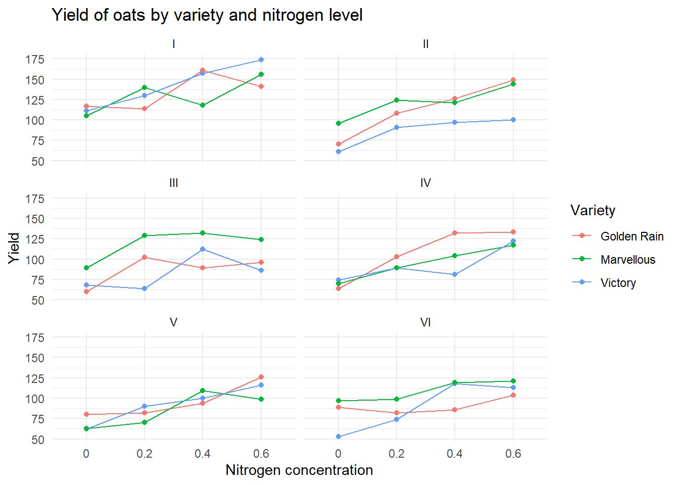 These data have been introduced by Yates (1935) as an example of a split-plot design (material extracted from Durban, 2014). The experimental units were arranged into six block using a \(3 \times 4\) full factorial design, with three varieties of oats and four nitrogen concentrations. The term full factorial means that every variety was used with every nitrogen concentration.