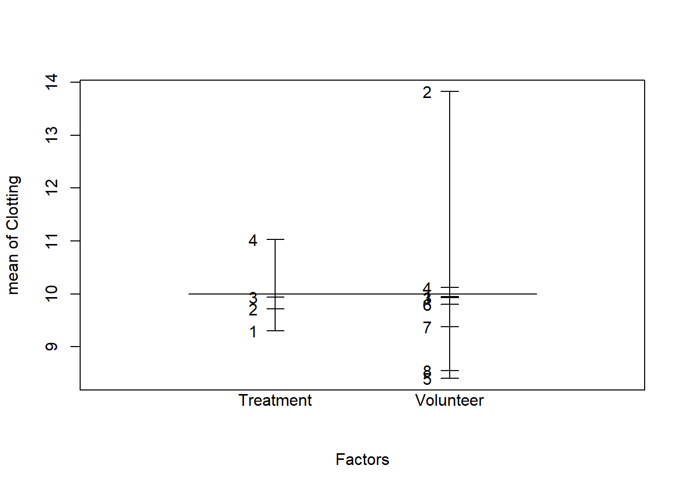 2. Which variable should be included as a fixed effect, and which as a random effect? Make a design plot to visually compare the magnitude of the effects of the Treatment and Volunteer factors.