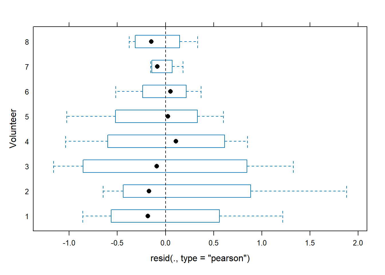 The eight subjects represents a sample from the population about which we wish to make inferences (random factor), so we use random effects to model the Volunteer factor.