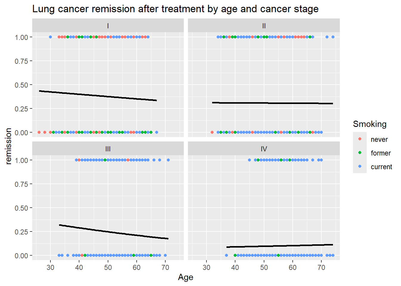 ggplot(patients, aes(x=Age, y=remission, color=Smoking)) +geom_point() +stat_smooth(method="glm", color="black", se=FALSE,method.args =list(family=binomial)) +ggtitle("Lung cancer remission after treatment by age and cancer stage") +facet_wrap(~ CancerStage)