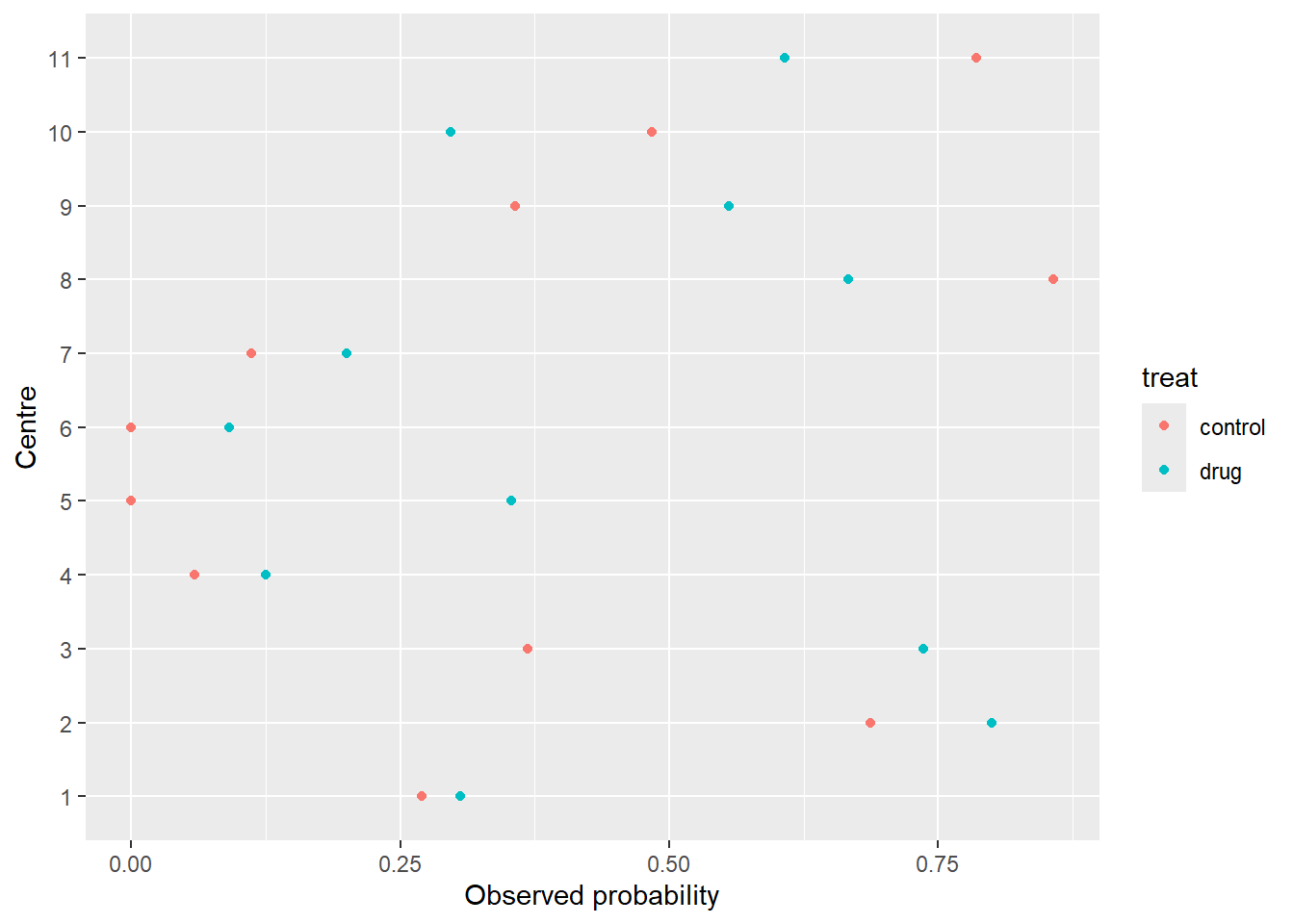 For \(u_i=0\), the probability of a positive response over a population of centres under the active drug group (\(x_{ij}=1\)) is \(\hat{\pi}_{ij}=0.376\) with a 95% confidence interval of \([0.220, 0.564]\).