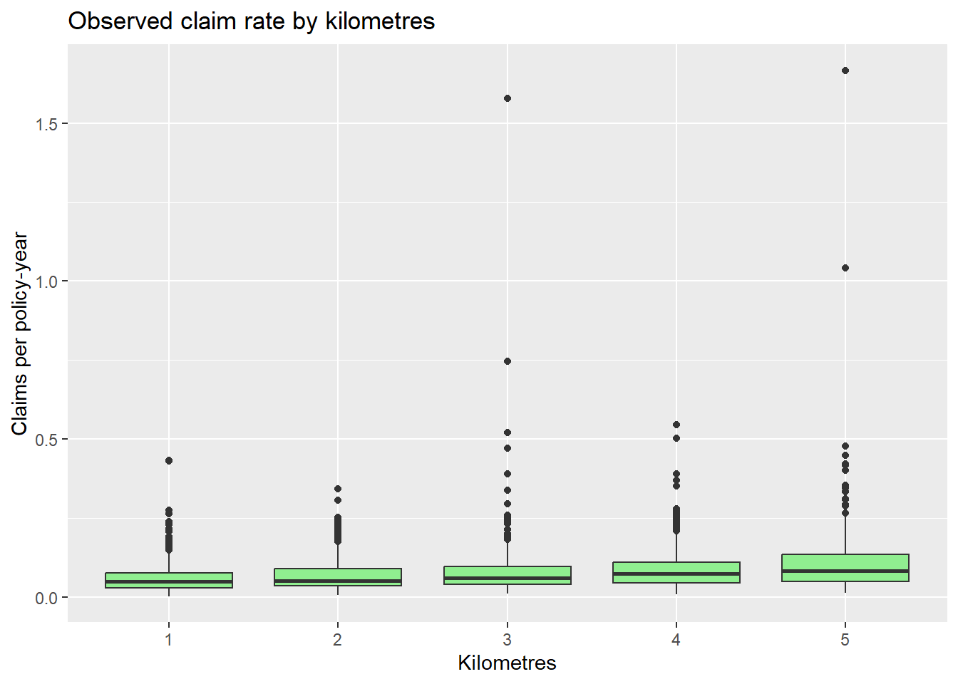 ggplot(MotorIns, aes(x = Km, y = rate)) +geom_boxplot(fill ="lightgreen") +labs(title ="Observed claim rate by kilometres",y ="Claims per policy-year",x ="Kilometres")