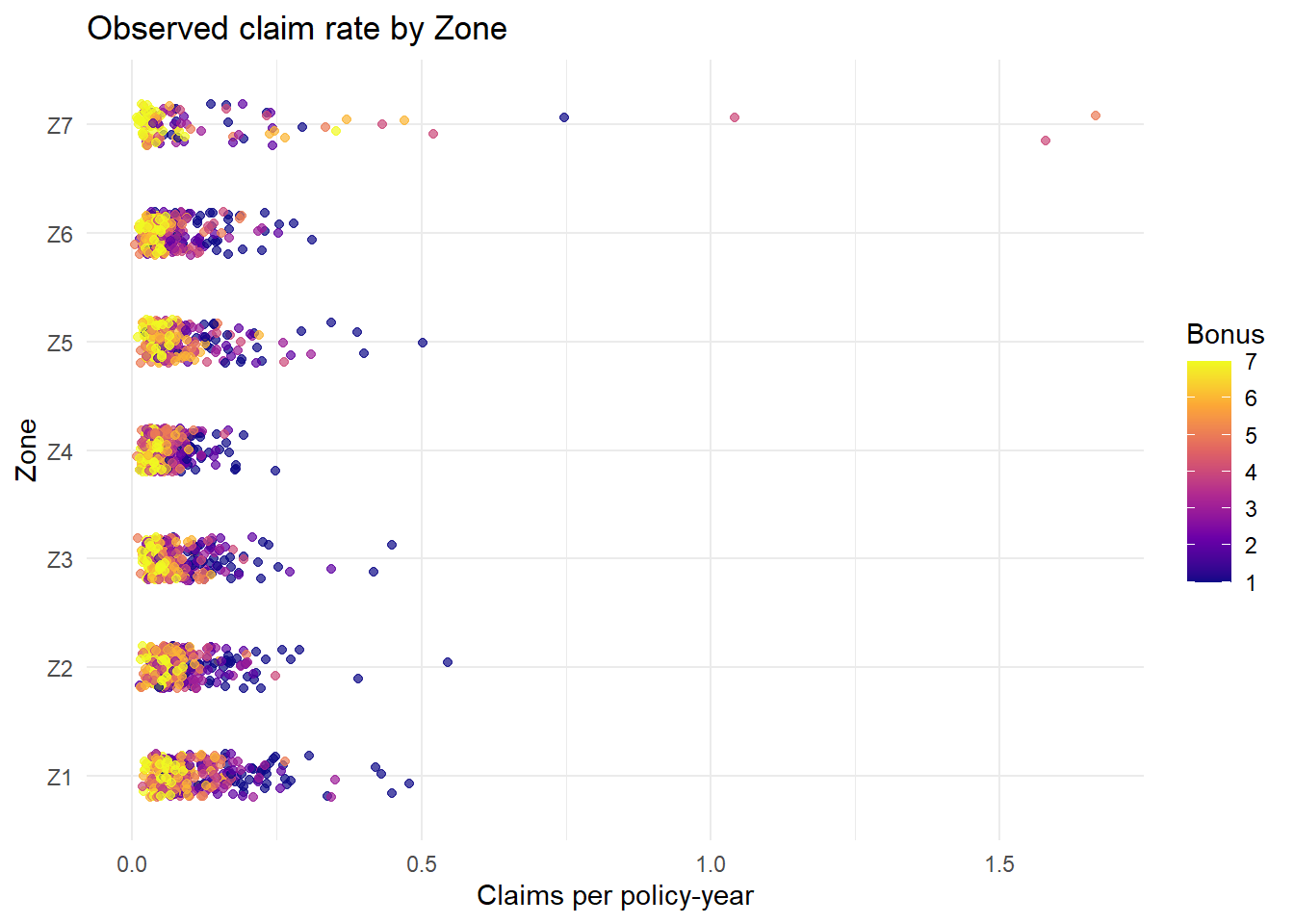 ggplot(MotorIns, aes(x = rate, y = Zone, color = Bonus)) +geom_jitter(height =0.2, alpha =0.7) +# dispersa los puntos verticalmentescale_color_viridis_c(option ="plasma") +# escala de colores continualabs(title ="Observed claim rate by Zone",x ="Claims per policy-year",y ="Zone",color ="Bonus" ) +theme_minimal()