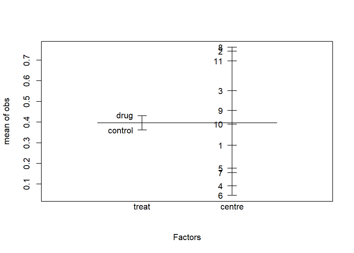 2. Which variable should be included as a fixed effect, and which as a random effect? Make a design plot to visually compare the magnitude of the effects of the centre and treat factors.