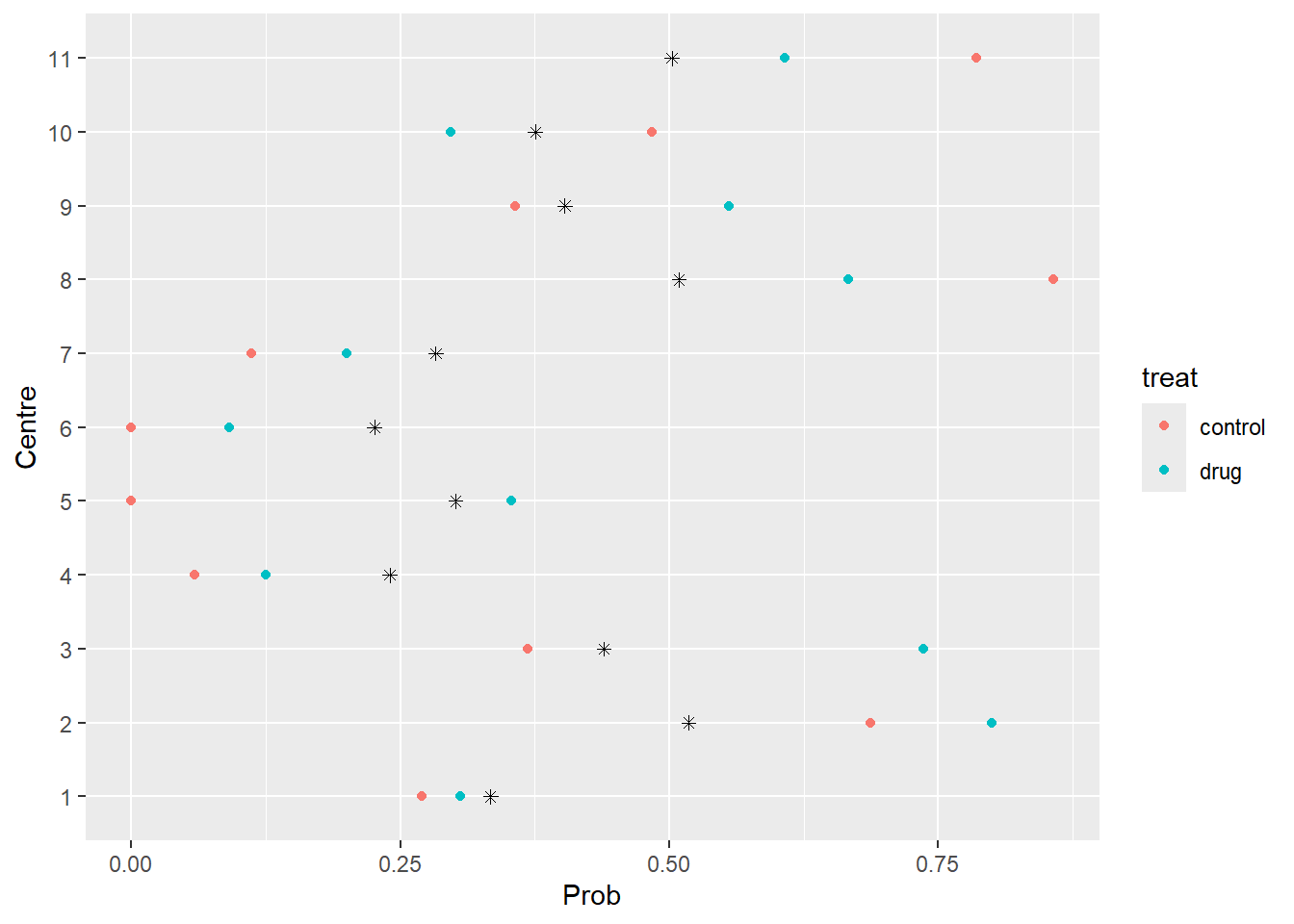 Observed (dots) and predicted (asterisks) probabilities of a positive response for each centre