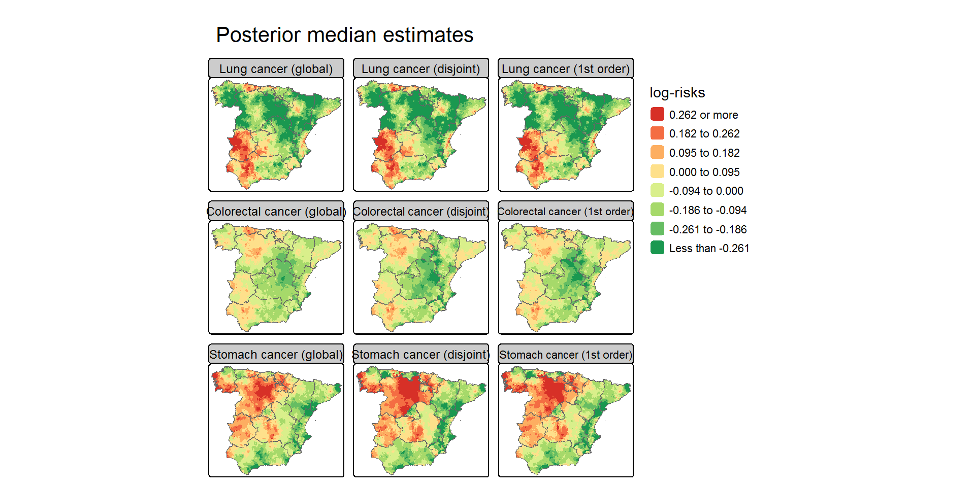 ## Maps with posterior median estimates of log-riskscarto <- Carto_SpainMUNS <-nrow(carto)J <-length(unique(Data_MultiCancer$disease))logRisk.Global <-matrix(iCAR.Global$summary.linear.predictor$`0.5quant`,S,J,byrow=F)carto$Global.disease1 <- logRisk.Global[,1]carto$Global.disease2 <- logRisk.Global[,2]carto$Global.disease3 <- logRisk.Global[,3]logRisk.k0 <-matrix(iCAR.k0$summary.linear.predictor$`0.5quant`,S,J,byrow=F)carto$k0.disease1 <- logRisk.k0[,1]carto$k0.disease2 <- logRisk.k0[,2]carto$k0.disease3 <- logRisk.k0[,3]logRisk.k1 <-matrix(iCAR.k1$summary.linear.predictor$`0.5quant`,S,J,byrow=F)carto$k1.disease1 <- logRisk.k1[,1]carto$k1.disease2 <- logRisk.k1[,2]carto$k1.disease3 <- logRisk.k1[,3]paleta <-brewer.pal(8,"RdYlGn")[8:1]values <-c(-Inf,log(c(0.77,0.83,0.91,1,1.10,1.20,1.30)),Inf)if(tmap4){ Map.risk <-tm_shape(carto) +tm_polygons(fill=c("Global.disease1","k0.disease1","k1.disease1","Global.disease2","k0.disease2","k1.disease2","Global.disease3","k0.disease3","k1.disease3"),fill.free=FALSE, col_alpha=0,fill.scale=tm_scale(values=paleta, breaks=values, interval.closure="left", midpoint=0),fill.legend=tm_legend("log-risks", show=TRUE, reverse=TRUE,position=tm_pos_out("right","center"),frame=FALSE)) +tm_shape(carto.CCAA) +tm_borders(col="gray40") +tm_title("Posterior median estimates") +tm_layout(panel.labels=c("Lung cancer (global)","Lung cancer (disjoint)","Lung cancer (1st order)","Colorectal cancer (global)","Colorectal cancer (disjoint)","Colorectal cancer (1st order)","Stomach cancer (global)","Stomach cancer (disjoint)","Stomach cancer (1st order)")) +tm_facets(nrow=3, ncol=3)}else{ Map.risk <-tm_shape(carto) +tm_polygons(col=c("Global.disease1","k0.disease1","k1.disease1","Global.disease2","k0.disease2","k1.disease2","Global.disease3","k0.disease3","k1.disease3"),palette=paleta, border.alpha=0, title="log-risks",legend.show=T, legend.reverse=T,style="fixed", breaks=values, interval.closure="left") +tm_shape(carto.CCAA) +tm_borders(col="gray40") +tm_layout(main.title="Posterior median estimates", main.title.position="center",panel.labels=c("Lung cancer (global)","Lung cancer (disjoint)","Lung cancer (1st order)","Colorectal cancer (global)","Colorectal cancer (disjoint)","Colorectal cancer (1st order)","Stomach cancer (global)","Stomach cancer (disjoint)","Stomach cancer (1st order)"),legend.outside=T, legend.outside.position="right", legend.frame=F,legend.outside.size=0.2, outer.margins=c(0.02,0.01,0.02,0.01)) +tm_facets(nrow=3, ncol=3)}tmap_mode("plot")print(Map.risk)