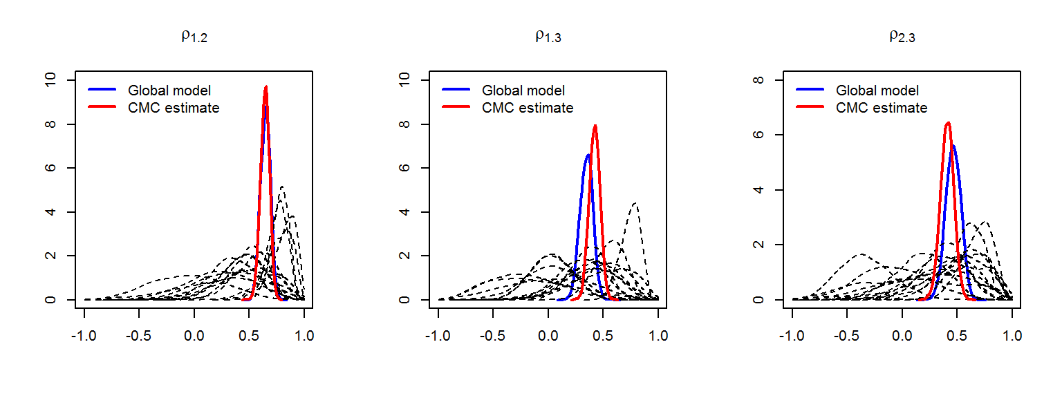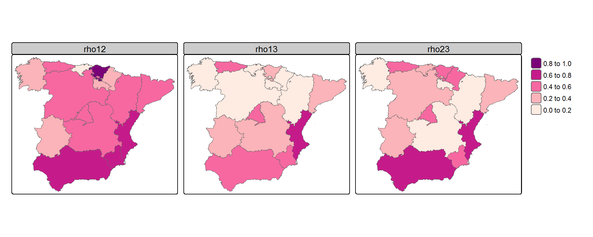 In addition to enlarge the effective sample size and improving smoothing by borrowing information from the different responses, one of the main advantages of multivariate disease mapping models is that they take into account correlations between the spatial patterns of the different diseases \({\rho}=(\rho_{12},\rho_{13},\rho_{23})^{'}\), that is, they reveal connections between diseases. In addition, it also provides the diagonal elements of the between-disease covariance matrix (\(\sigma^2_j\)), hereafter referred to as variance parameters, which control the amount of smoothing within diseases.